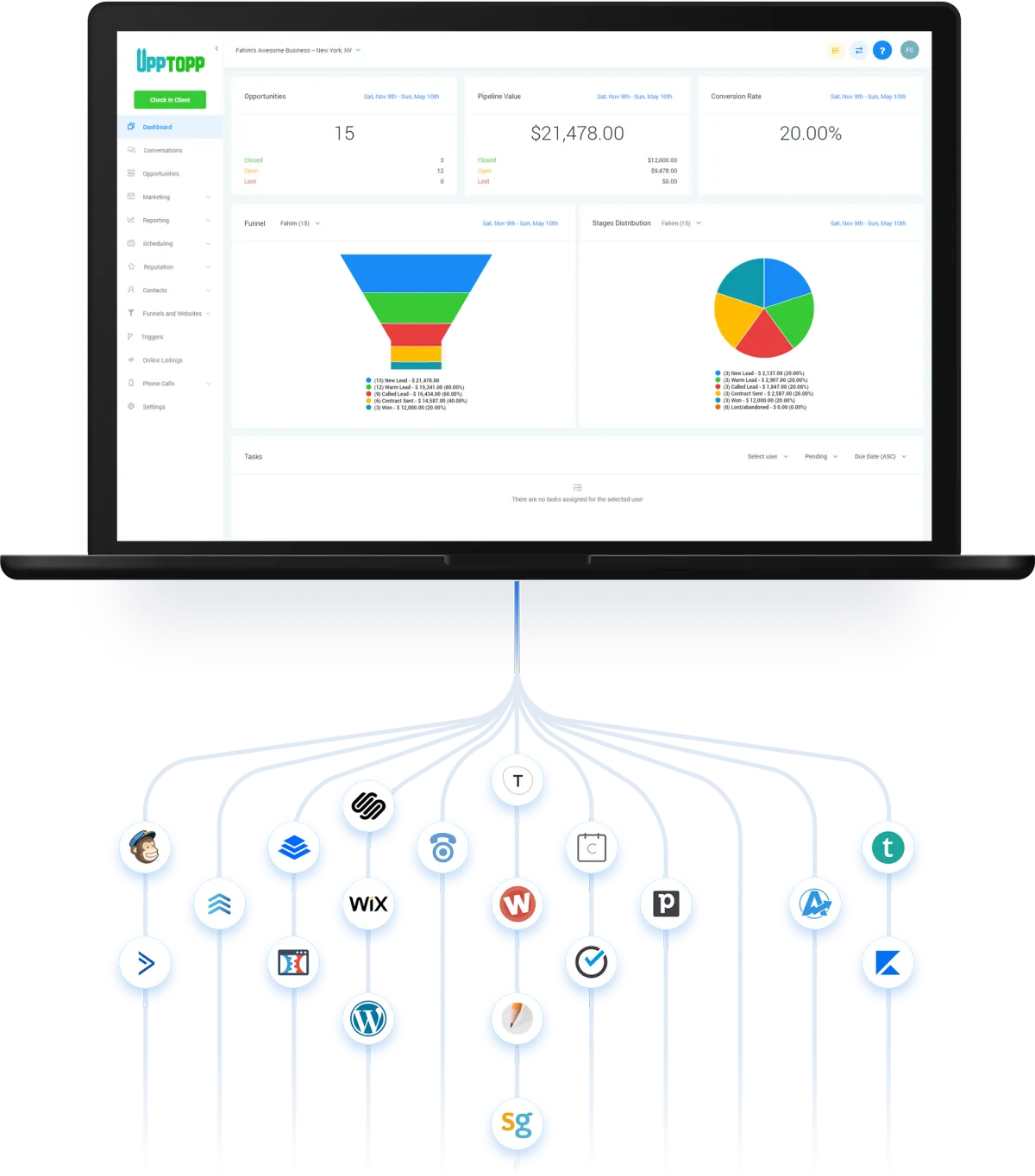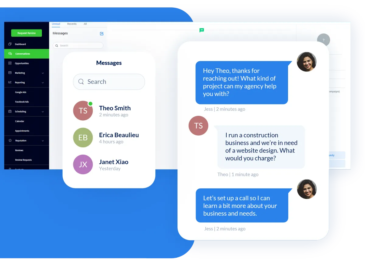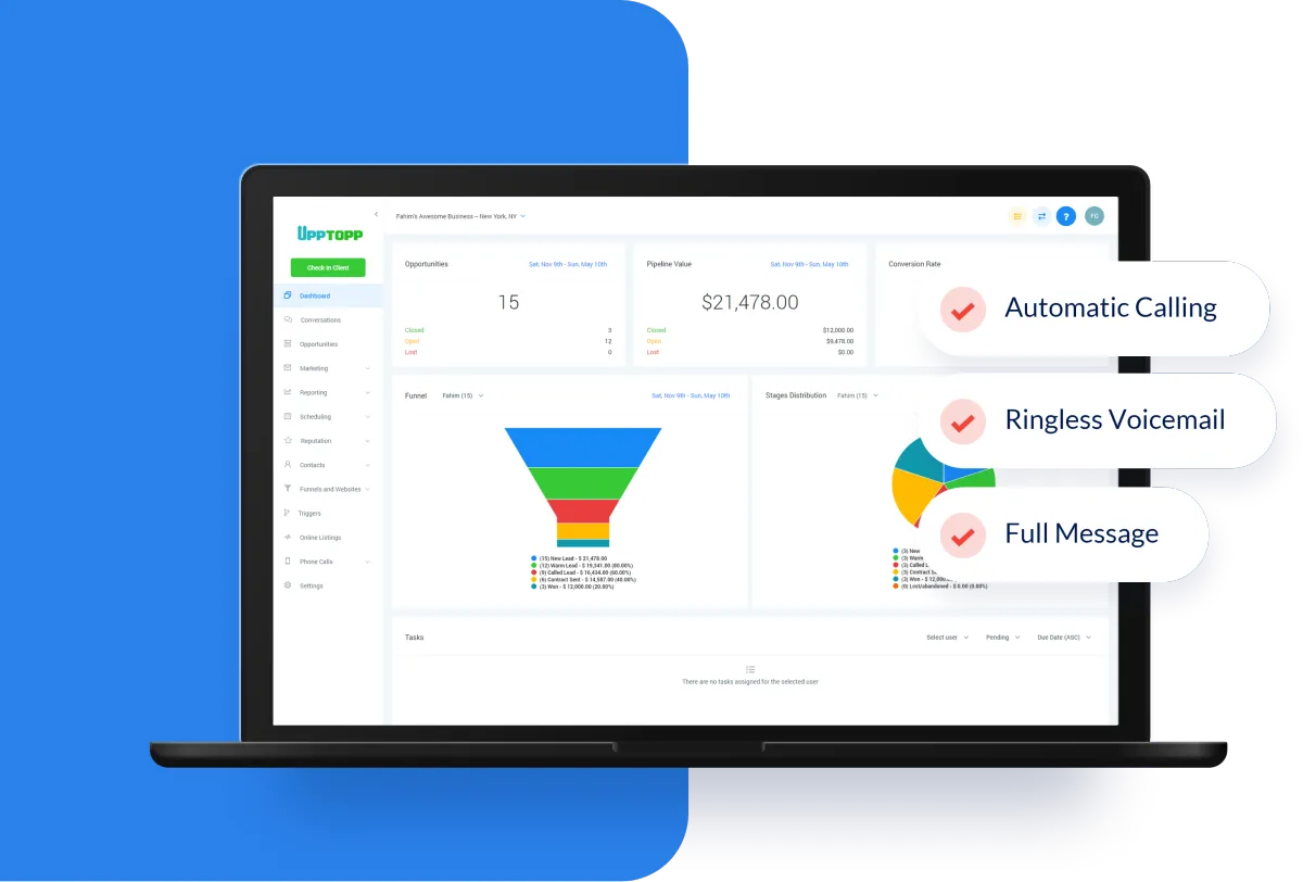 Build forms and funnel pages to capture leads, user automated sms, email, phone calls, voicemails, and Facebook Messages to nurture leads through custom pipelines, converse with leads & clients via text, phone, and Facebook Messenger (all in one stream), and more!