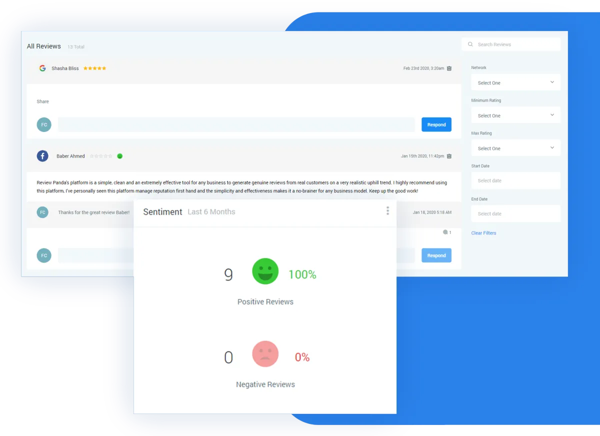 Send review requests via SMS and email with the push of a button. Monitor and reply to new reviews right within the dashboard.